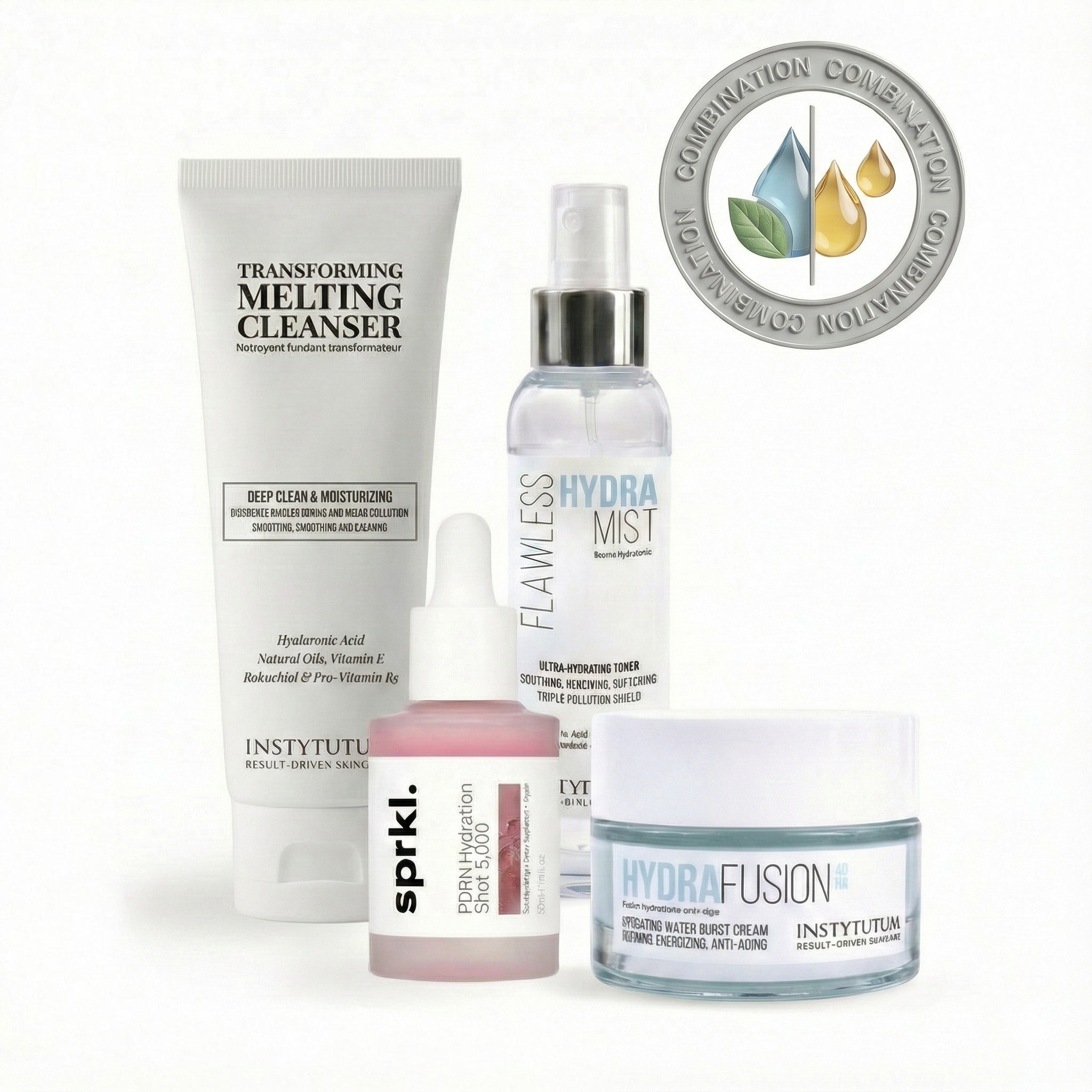 This routine balances skin that behaves differently across your face — oily in some areas, normal or dry in others. It helps regulate shine in the T-zone while keeping drier spots comfortably hydrated, leaving your complexion smooth, even, and naturally steady throughout the day.